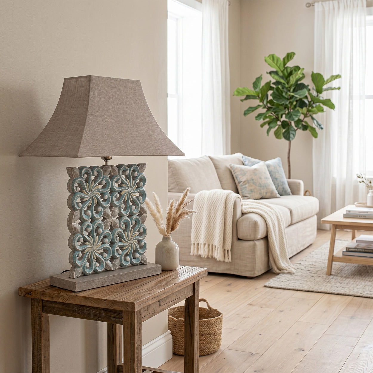 Wooden Carved Bedside Table 'Sekar' - Natural and Multicolor Blue - 60 cm