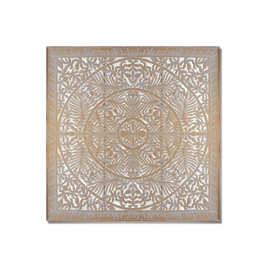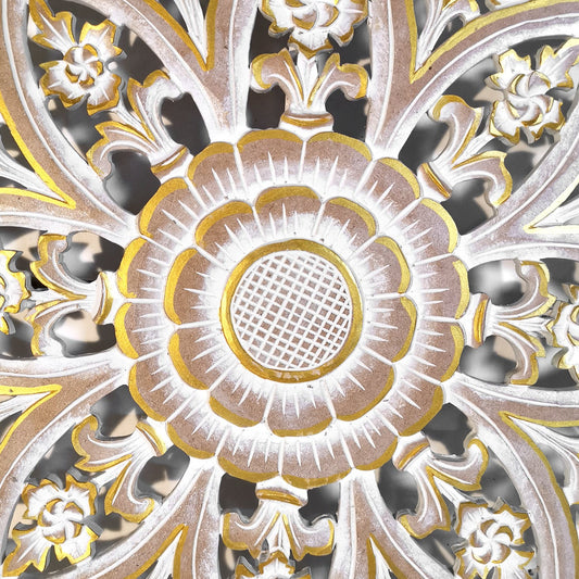 Hand Carved Queen Size Mandala Bed Headboard - 'Umadewi' in White Wash