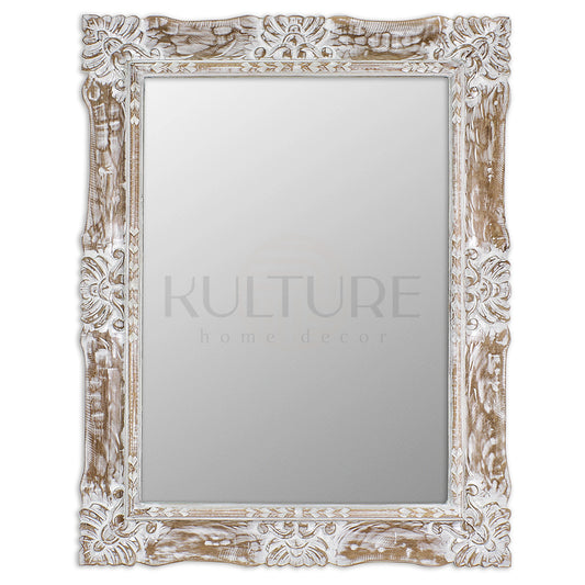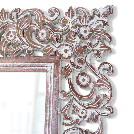 Hand Carved Mirror "Wanasari" in White Wash - 70 cm