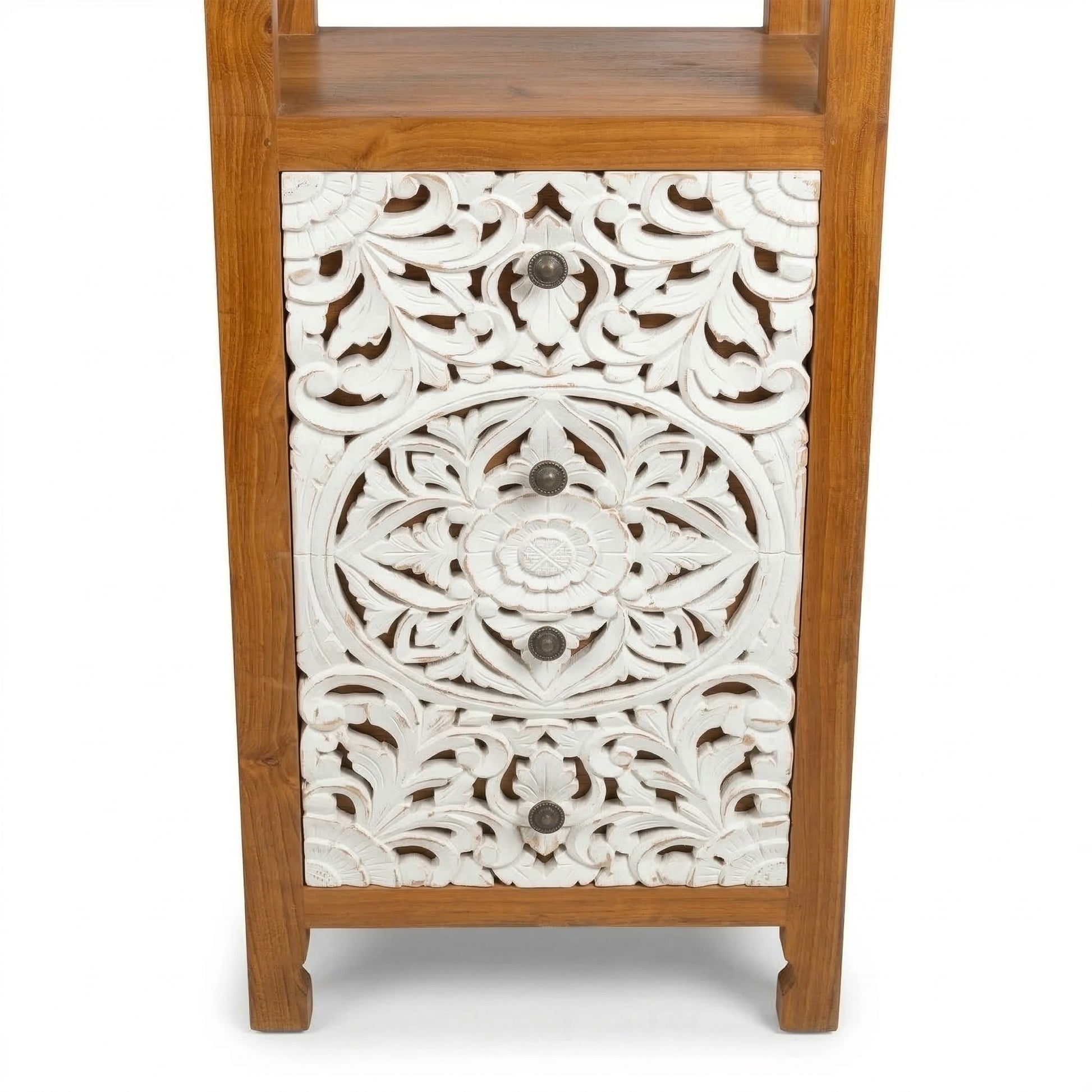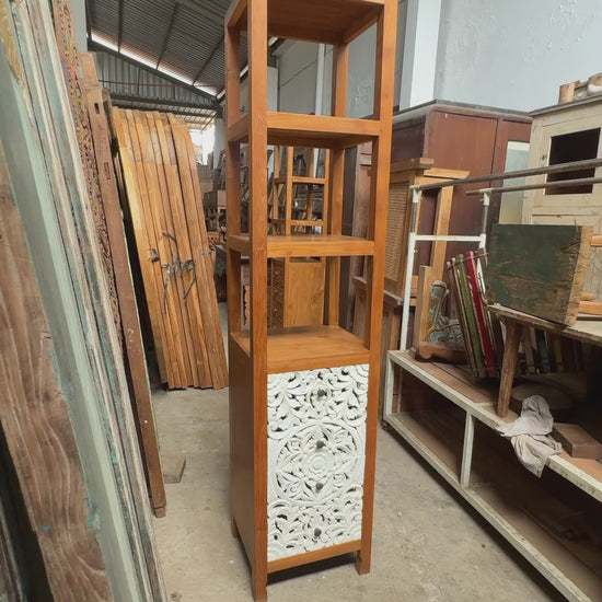 Teak Wood Hand-Carved Tall Display Shelf Cabinet with Drawers 'Mahesa' – 180 cm - Natural & White