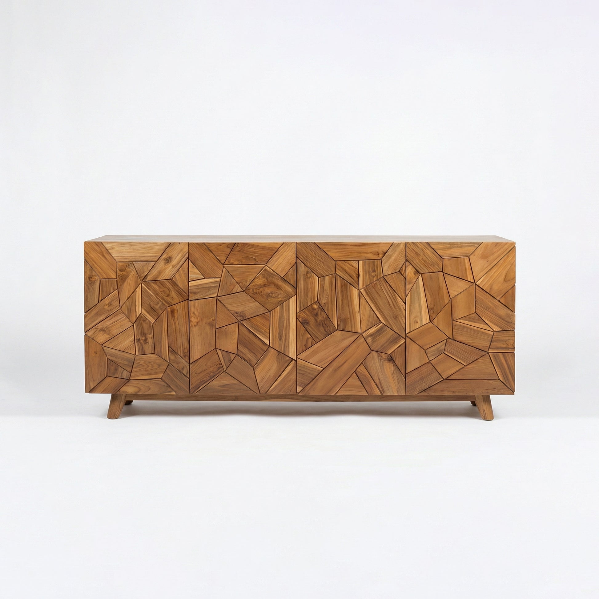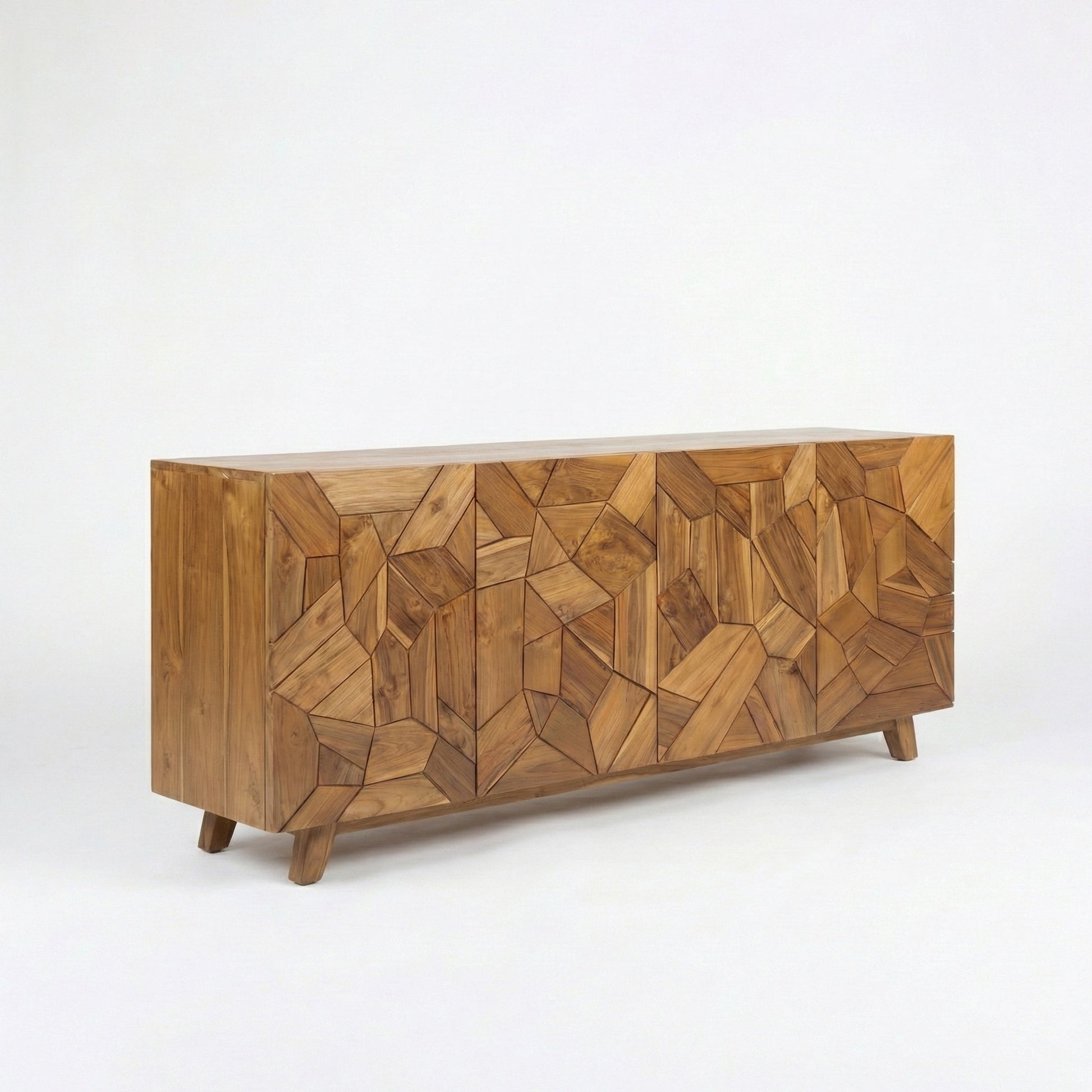 Crafted from old teak wood, this sideboard console cabinet offers exceptional strength, character, and longevity. The natural finish highlights the deep grain, texture, and unique markings of aged teak, ensuring every piece is truly one of a kind. Designed with practicality in mind, it features four doors, each opening to two internal racks, providing ample storage for media equipment, accessories, and everyday essentials while maintaining a clean, elegant look.