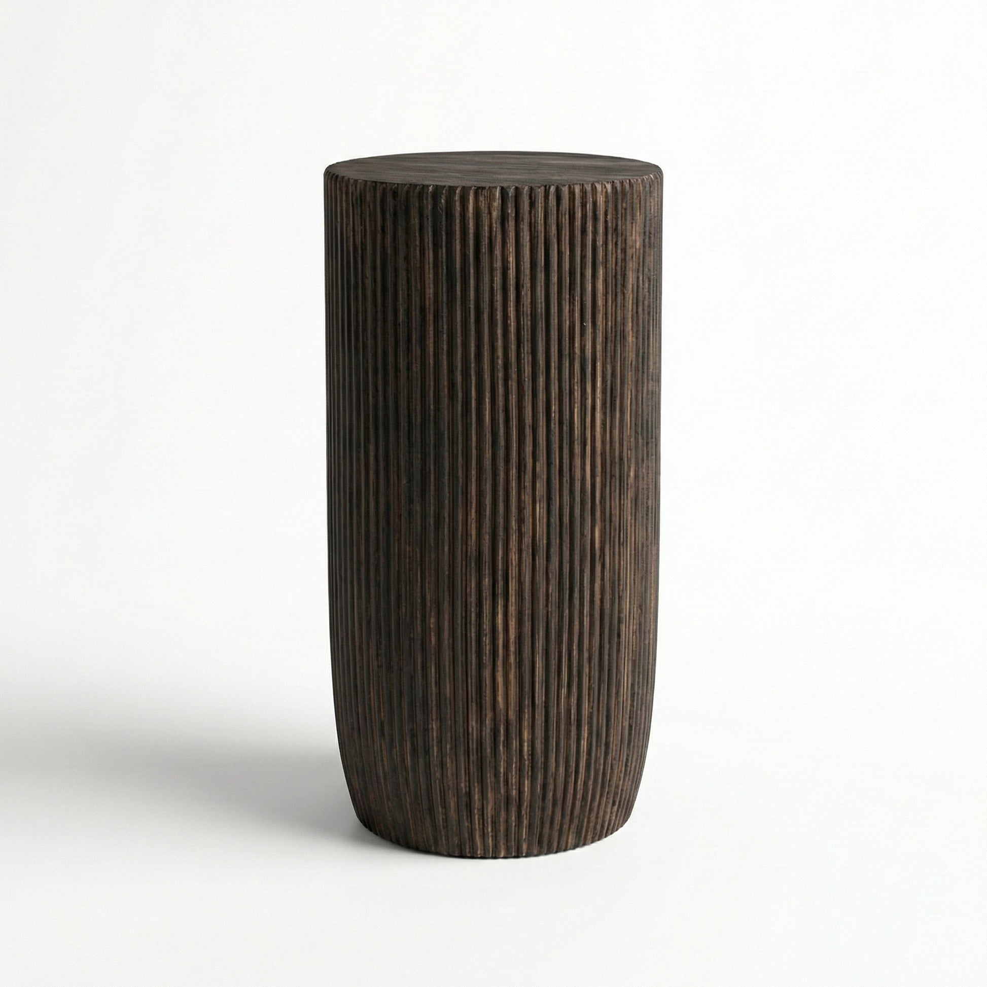 Measuring 35 cm in diameter and 60 cm in height, Modera works beautifully as a side table, bedside table, or occasional stool. Its rounded body and carved vertical details create a soft rhythm of light and shadow, highlighting the natural wood grain that makes every piece unique.